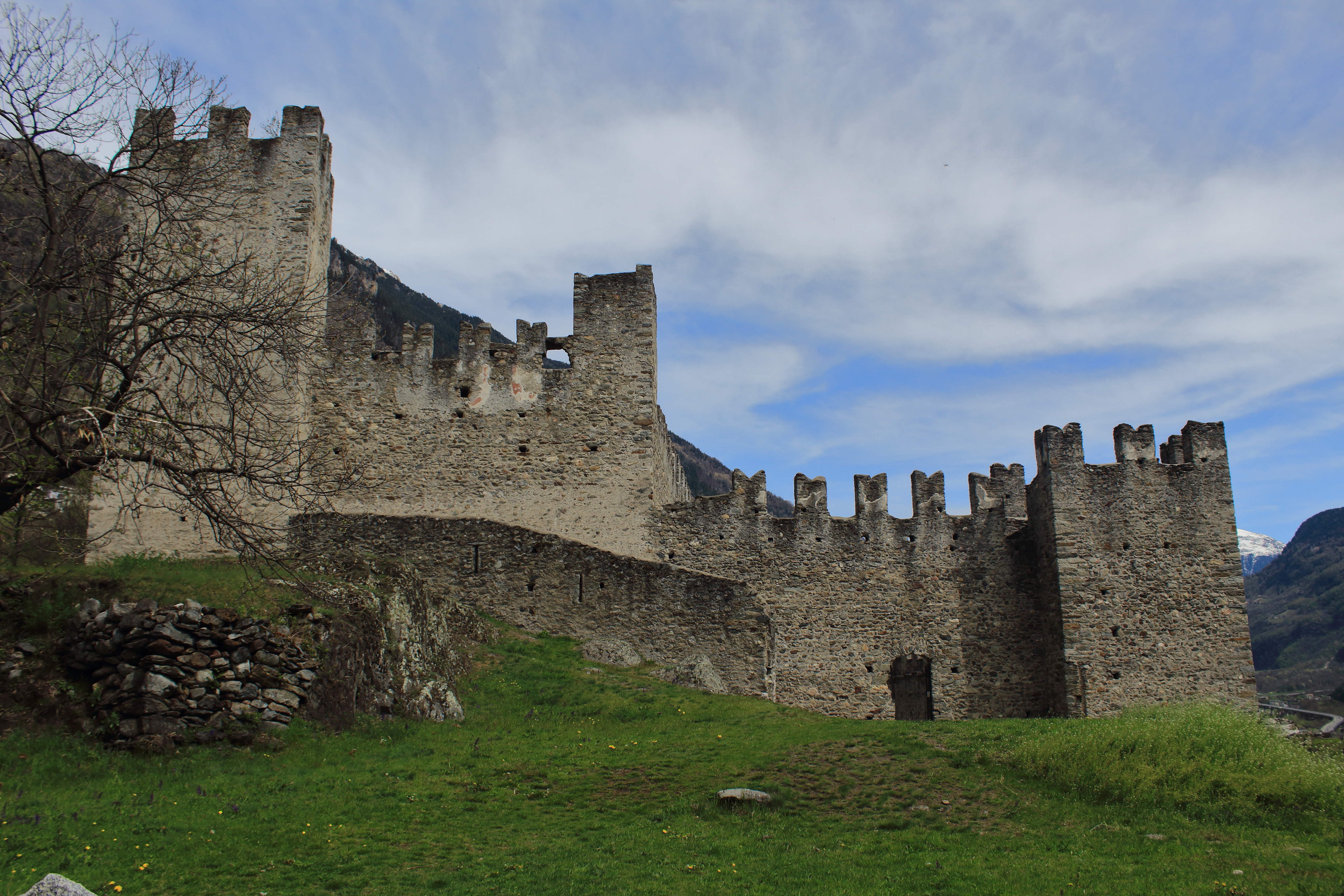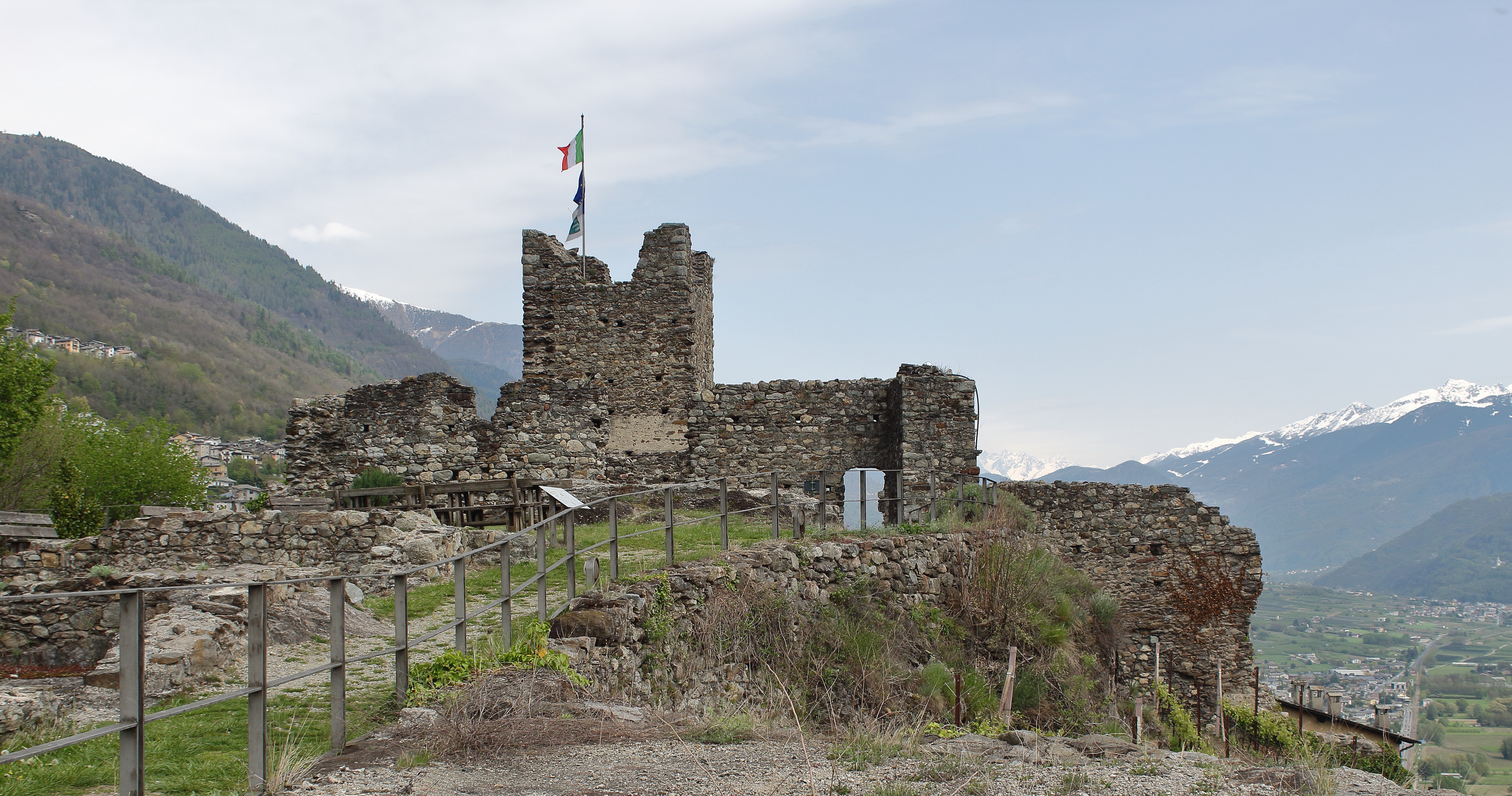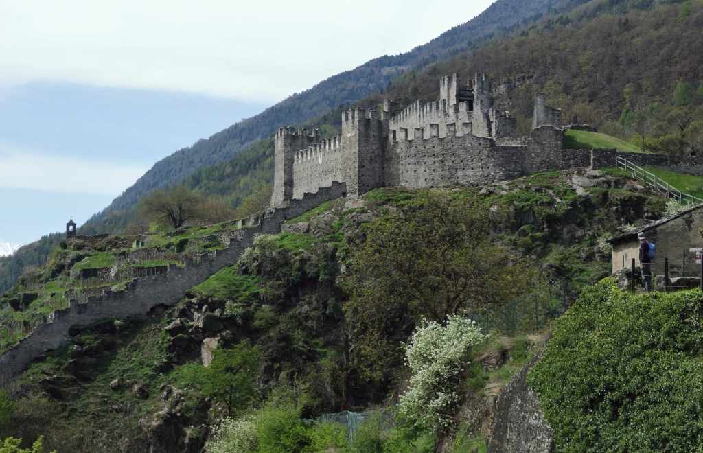 Terminato il pranzo, decidiamo di fare una passeggiata a Montagna in Valtellina tra i ruderi del Castel Grumello. La Valtellina in passato fu luogo prediletto per la costruzione di fortezze e castelli per via della sua posizione strategica. Tra questi vi è il Castel De Piro al Grumello chiamato così perché edificato su un dosso roccioso (“grumo”). Costruito tra il XIII e XIV secolo per mano del ghibellino Corrado de Piro, venne parzialmente distrutto nel 1526 dalle Leghe Grigie. La struttura è divisa in due aree: una militare, situata ad oriente, (che presenta una torre a pianta quadrata con una funzione difensiva) e l’altra residenziale. Sullo sfondo si stagliano le Alpi Retiche, che rendono il paesaggio unico e mozzafiato. A pochi passi dal rudere, filari infiniti di viti vengono coltivati per la produzione del Valtellina Superiore Grumello DOCG.