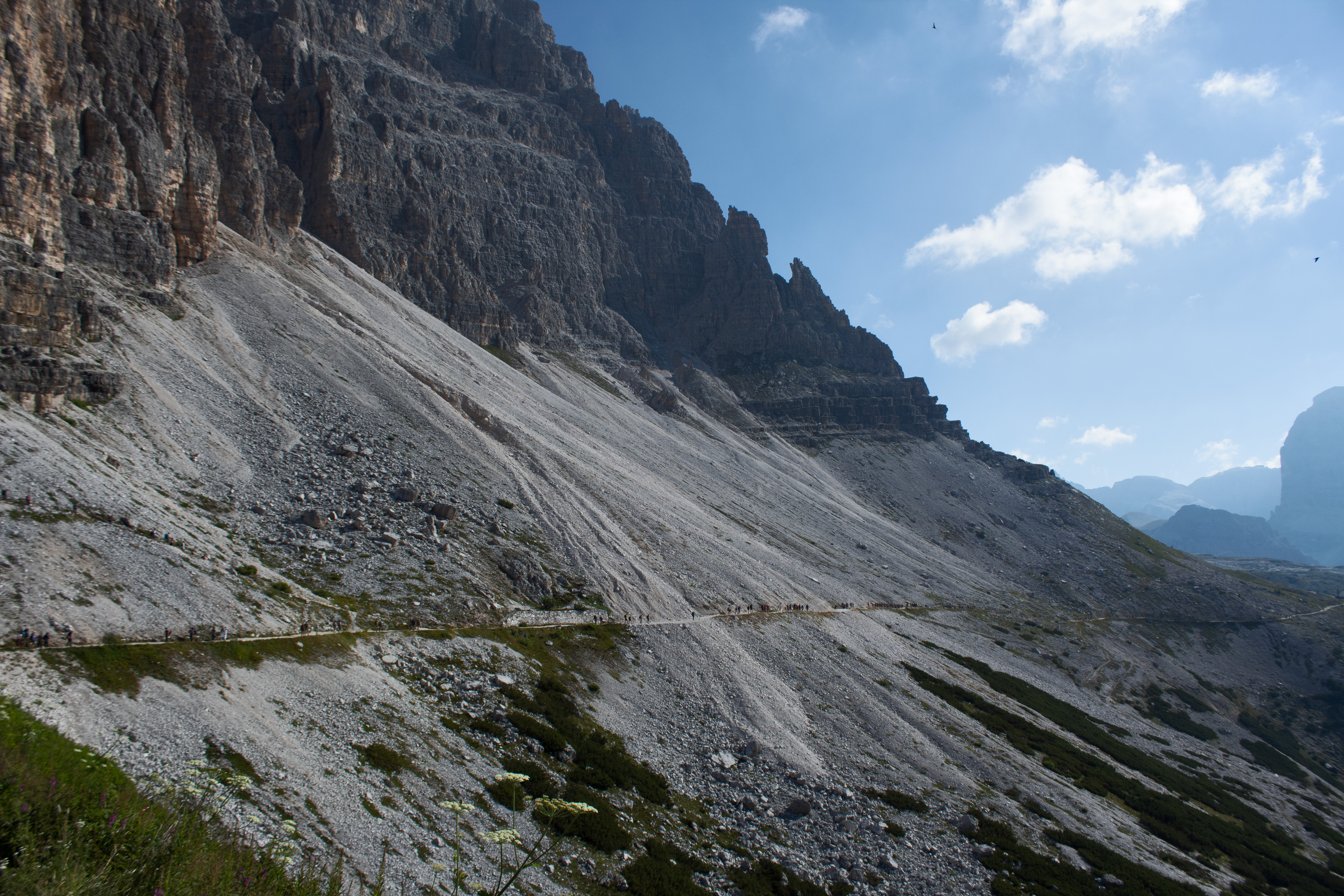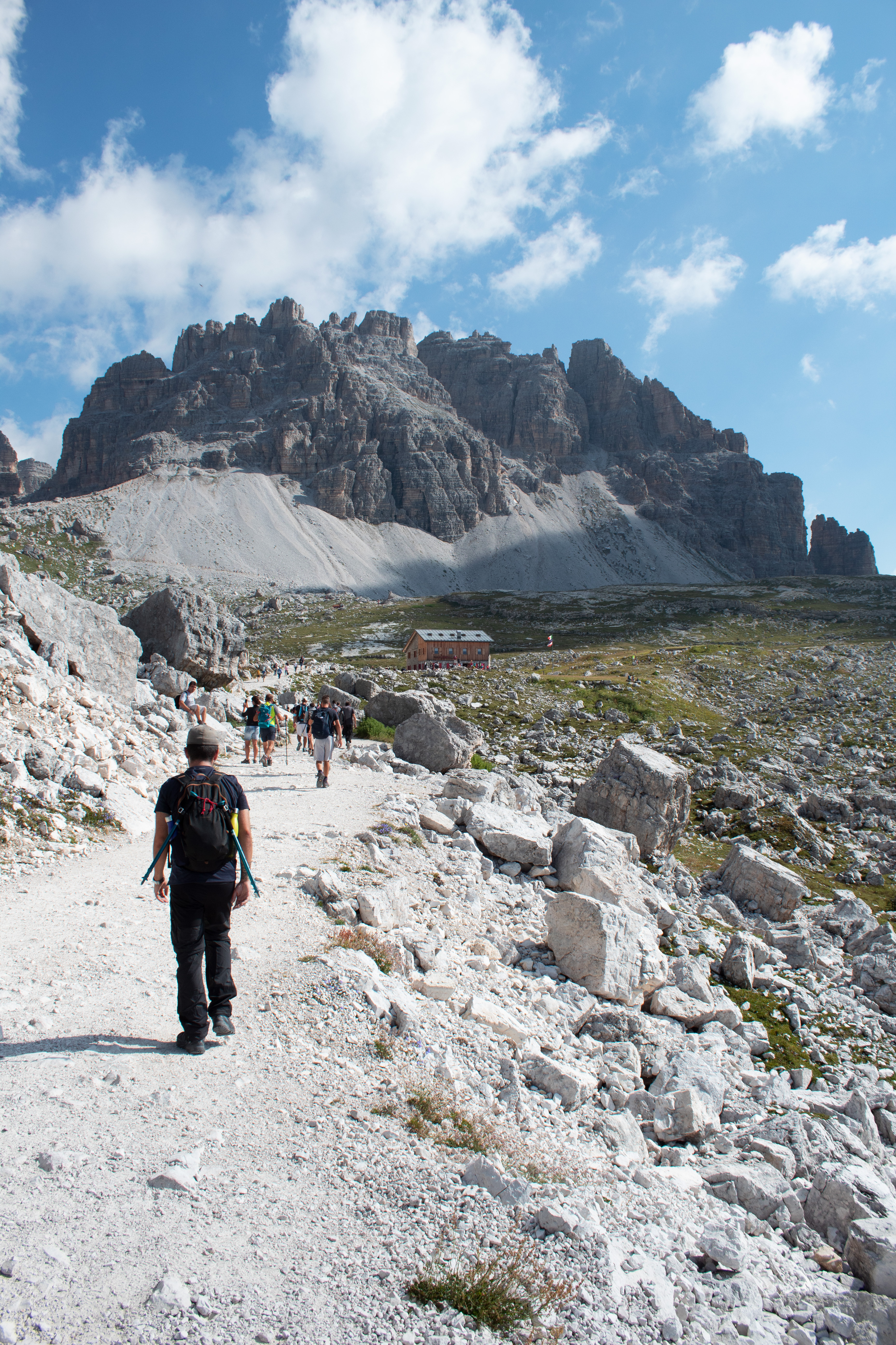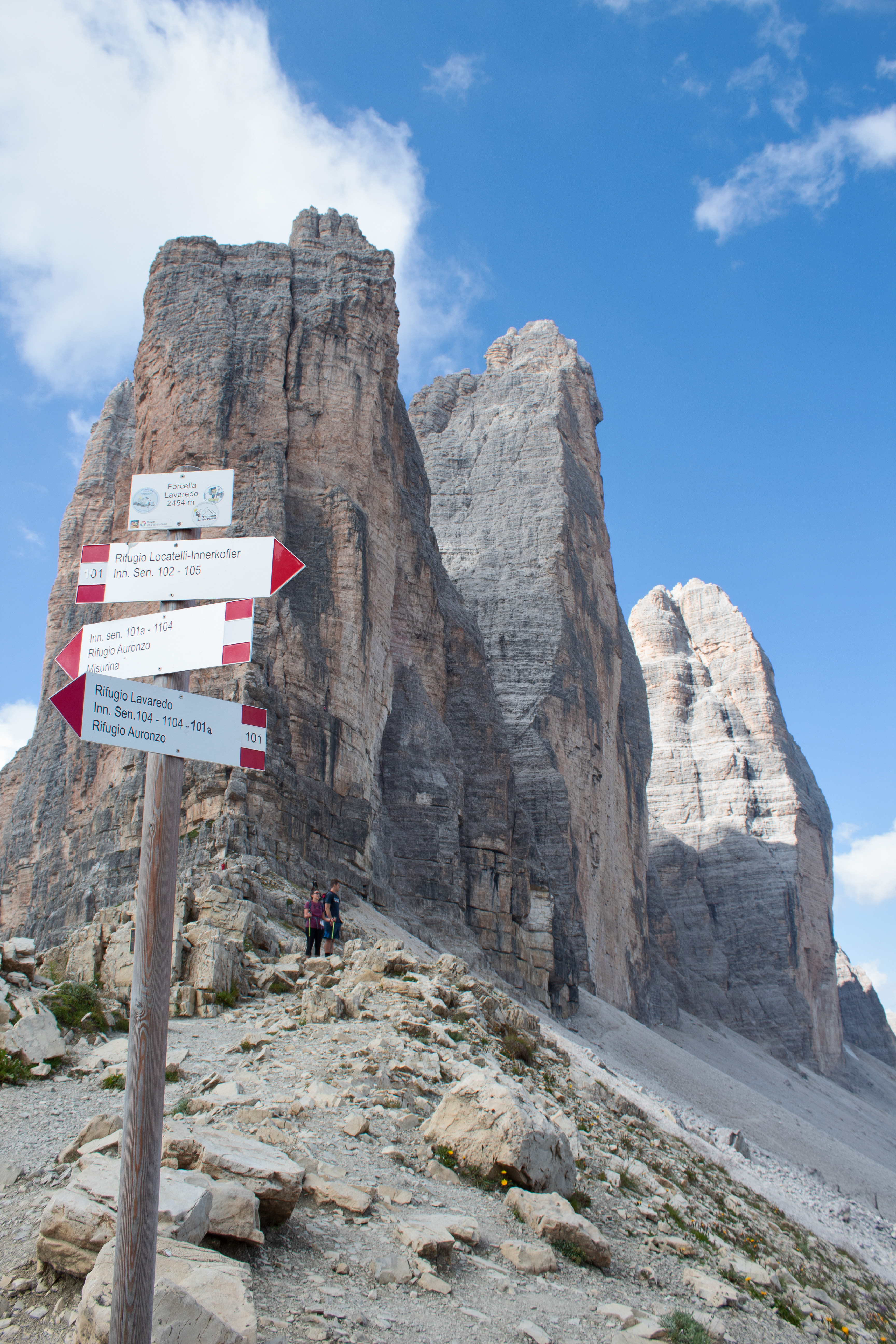 Da Forcella Lavaredo si diramano diversi sentieri che conducono al rifugio Locatelli. Si potrebbe proseguire sul sentiero 101 ma a causa dell’eccessivo sovraffollamento decidiamo di imboccare la strada sovrastante alla volta dell’immensa conca ghiaiosa: molto più bella e soprattutto panoramica. Questo tratto di sentiero non presenta particolari difficoltà anche se è bene prestare particolare attenzione ai tratti in cui parte della strada segnalata è crollata a causa di frane. A qualche centinaio di metri dal rifugio vi è una piccola grotta da dove è possibile ammirare uno scorcio del tutto particolare delle Tre Cime.