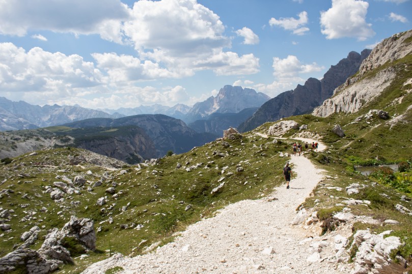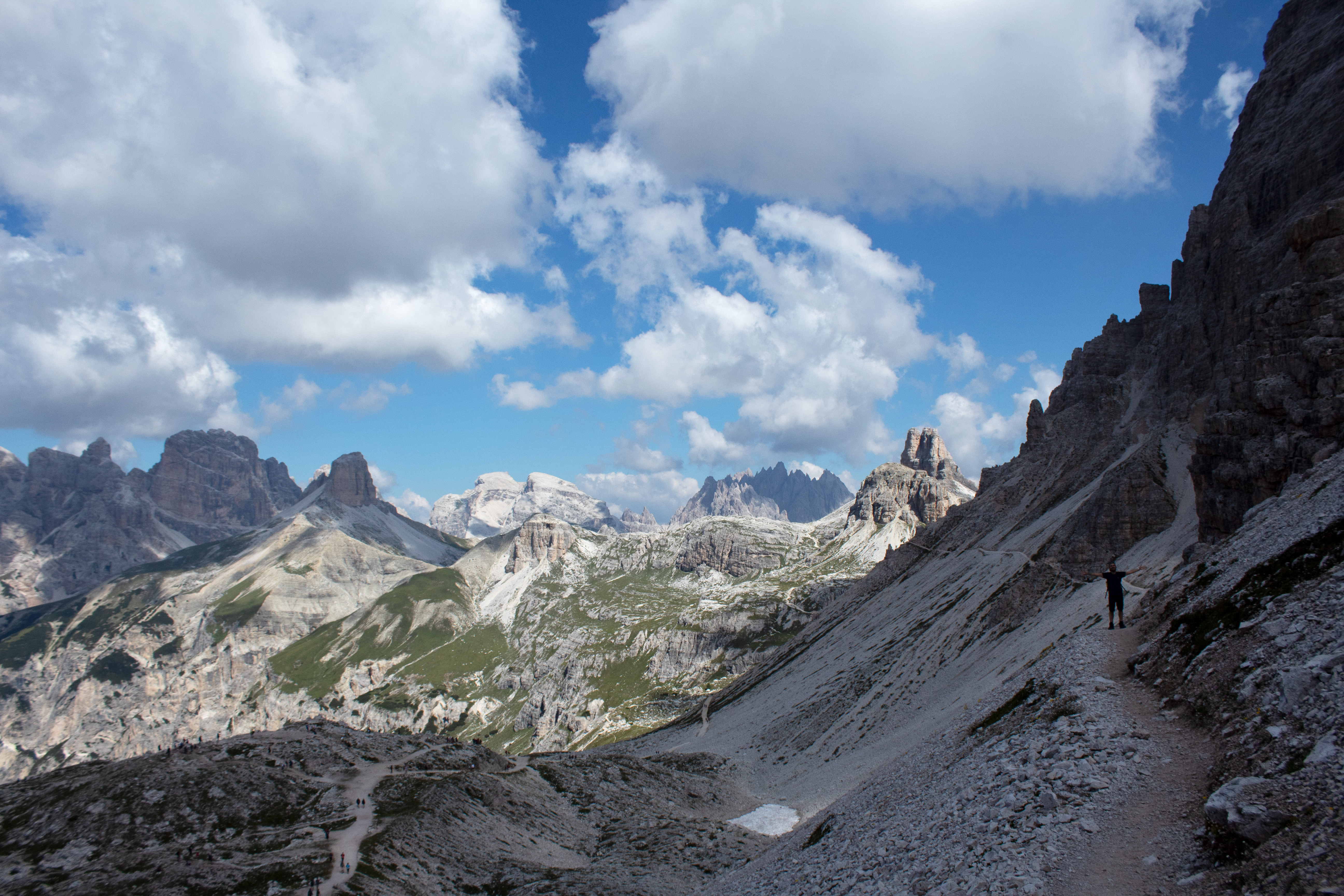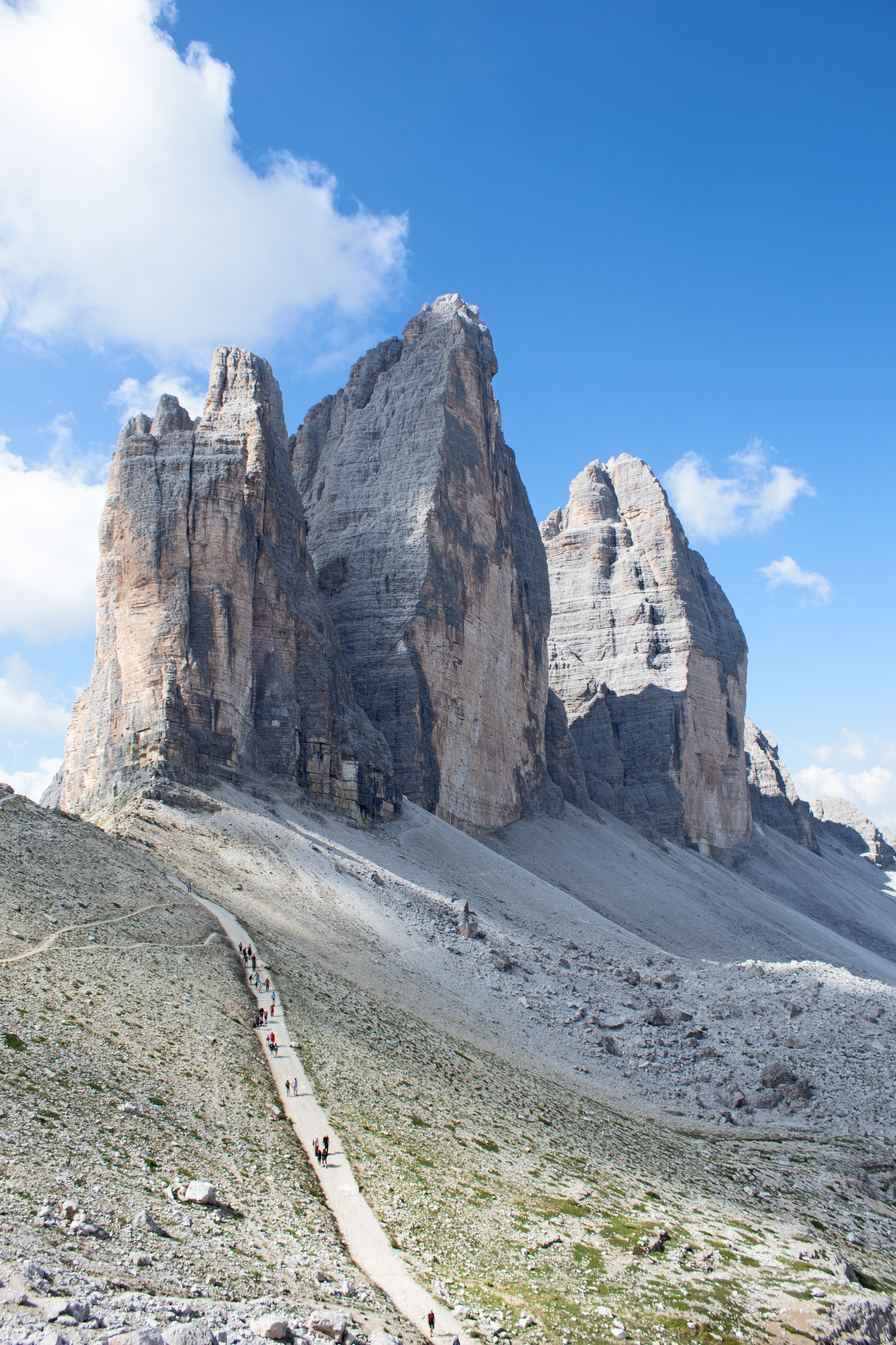 Da Forcella Lavaredo si diramano diversi sentieri che conducono al rifugio Locatelli. Si potrebbe proseguire sul sentiero 101 ma a causa dell’eccessivo sovraffollamento decidiamo di imboccare la strada sovrastante alla volta dell’immensa conca ghiaiosa: molto più bella e soprattutto panoramica. Questo tratto di sentiero non presenta particolari difficoltà anche se è bene prestare particolare attenzione ai tratti in cui parte della strada segnalata è crollata a causa di frane. A qualche centinaio di metri dal rifugio vi è una piccola grotta da dove è possibile ammirare uno scorcio del tutto particolare delle Tre Cime.