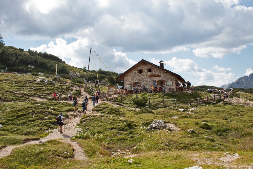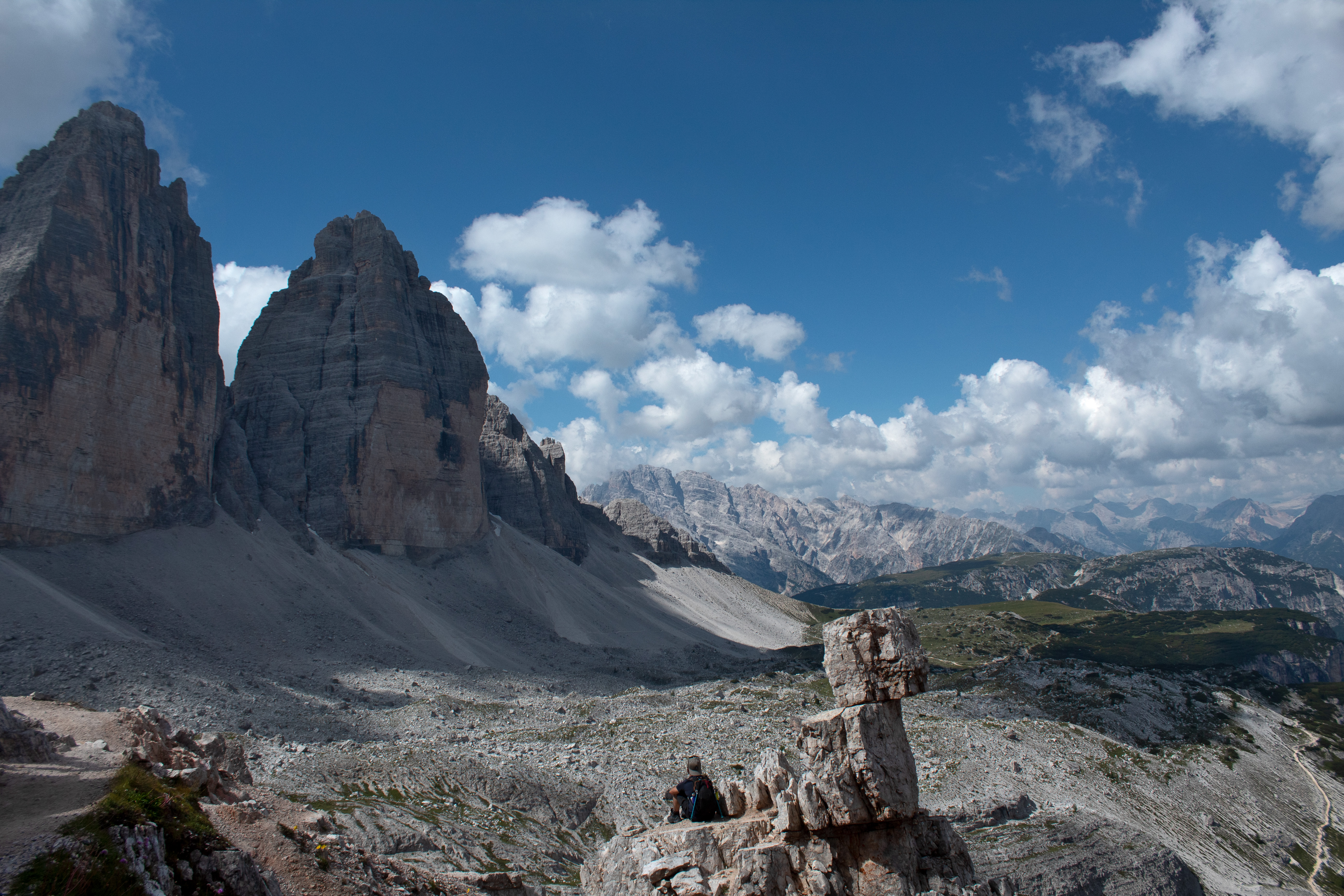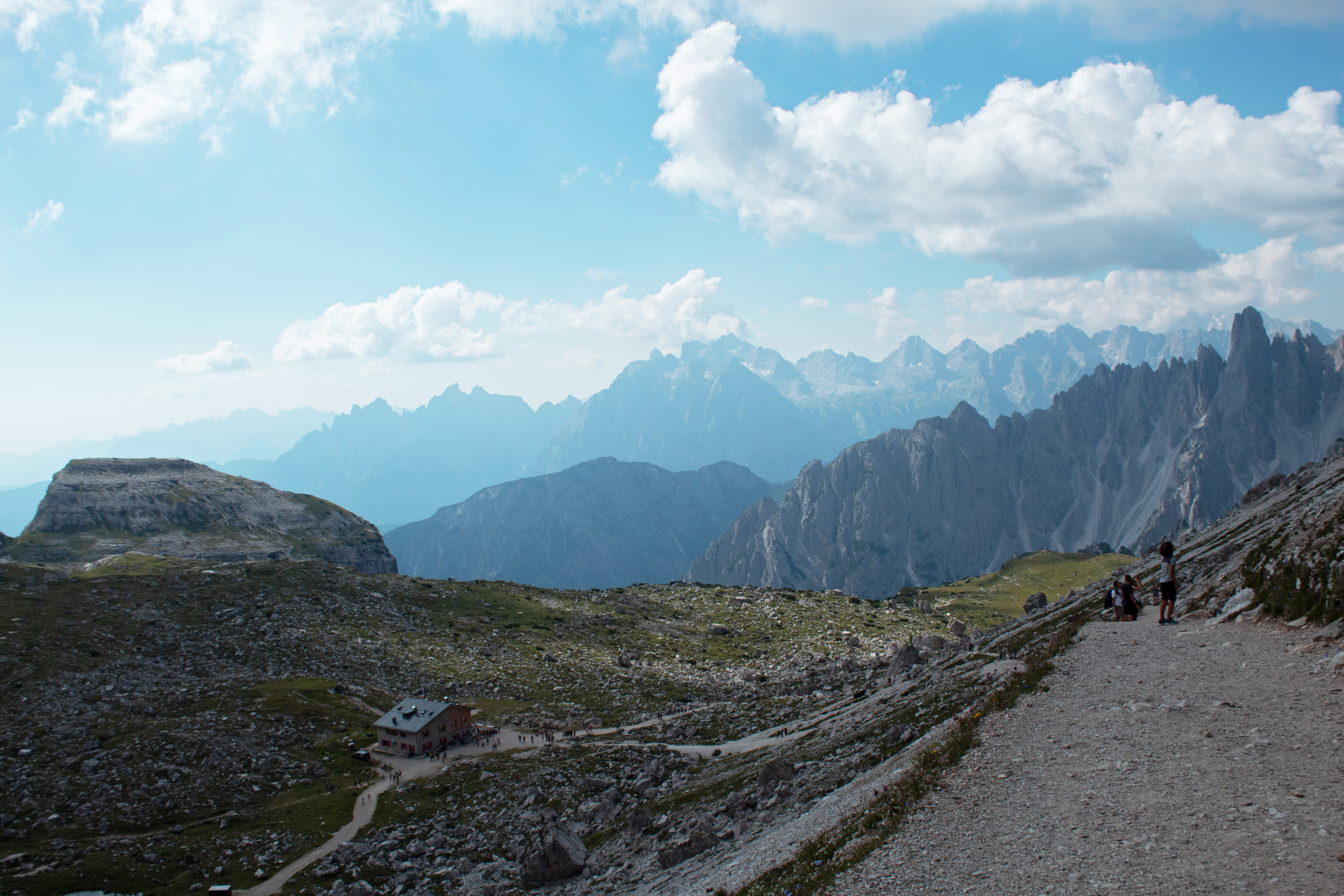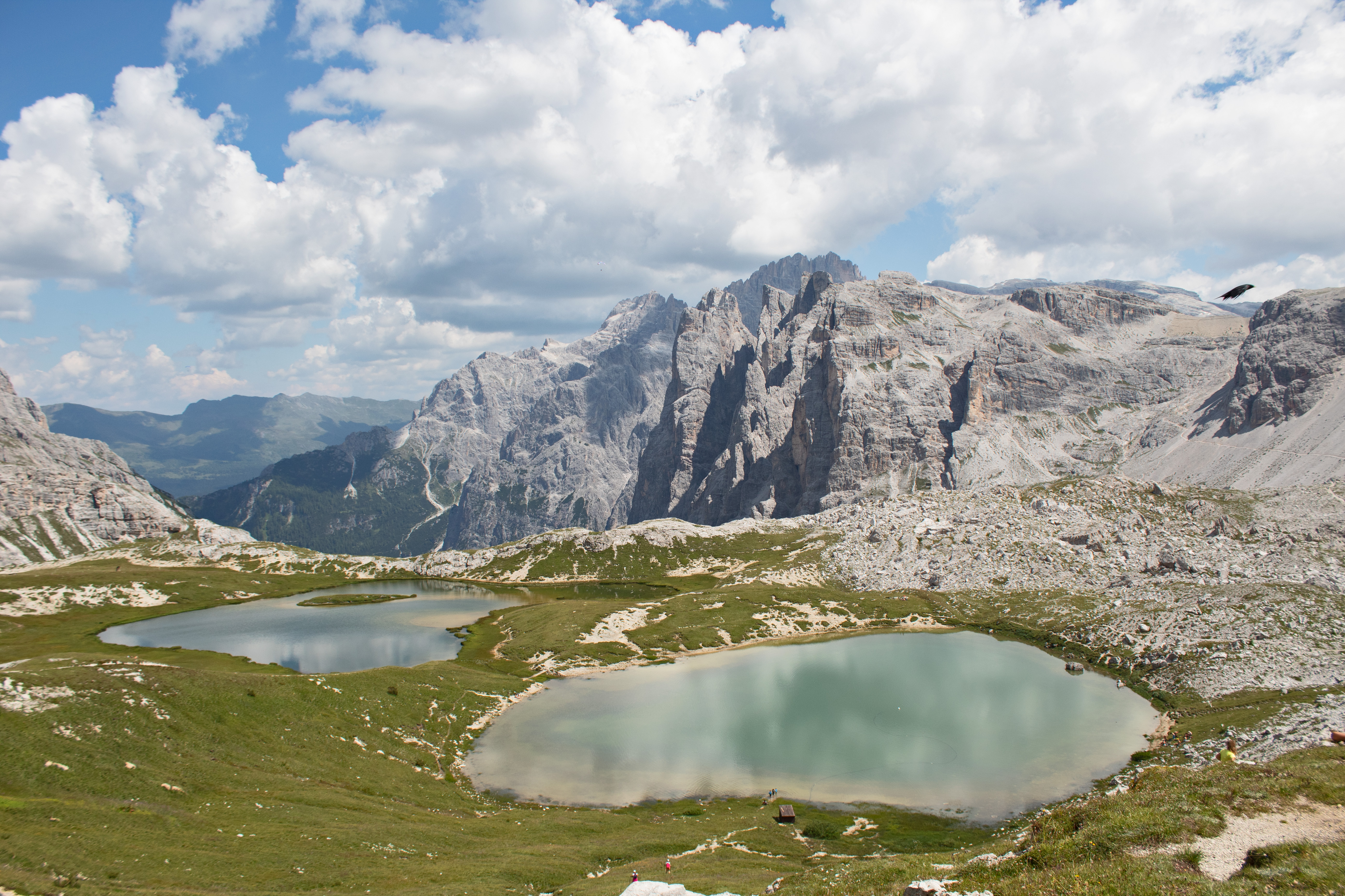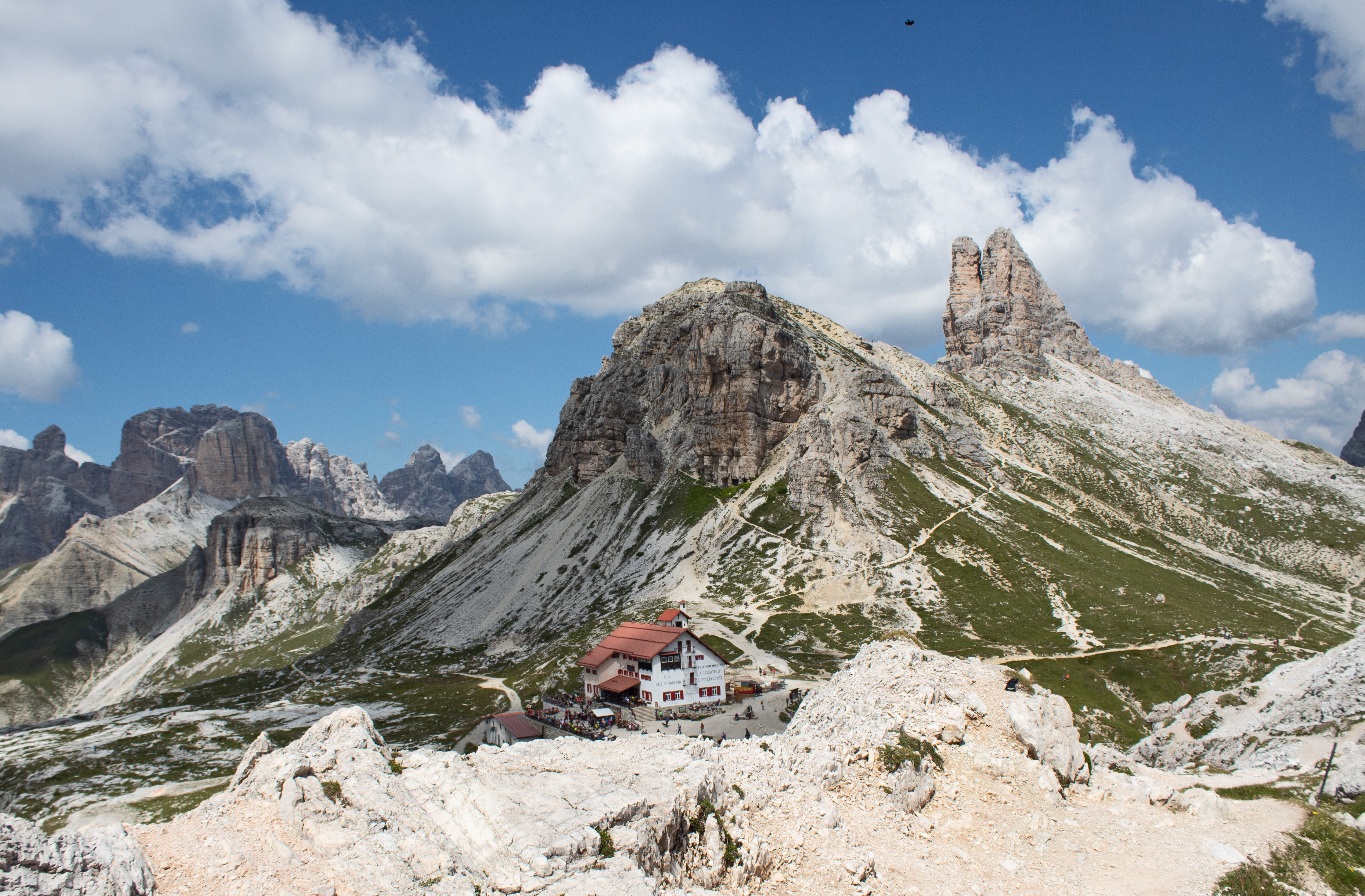 Raggiungiamo così il rifugio Locatelli a quota 2450 metri: un luogo spettacolare dove transita l’Alta Via n.4. Di proprietà dei CAI di Padova, il rifugio venne eretto nel 1882 e ricostruito dopo la prima guerra mondiale. Davanti a noi il simbolo delle Dolomiti: le Tre Cime di Lavaredo. Qui ci fermiamo per una pausa, stesi ad ammirare le magnifiche vette dolomitiche e i due Laghi dei Piani, ai piedi del Monte Paterno.
