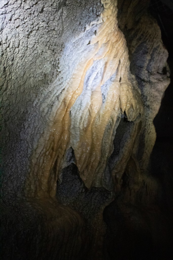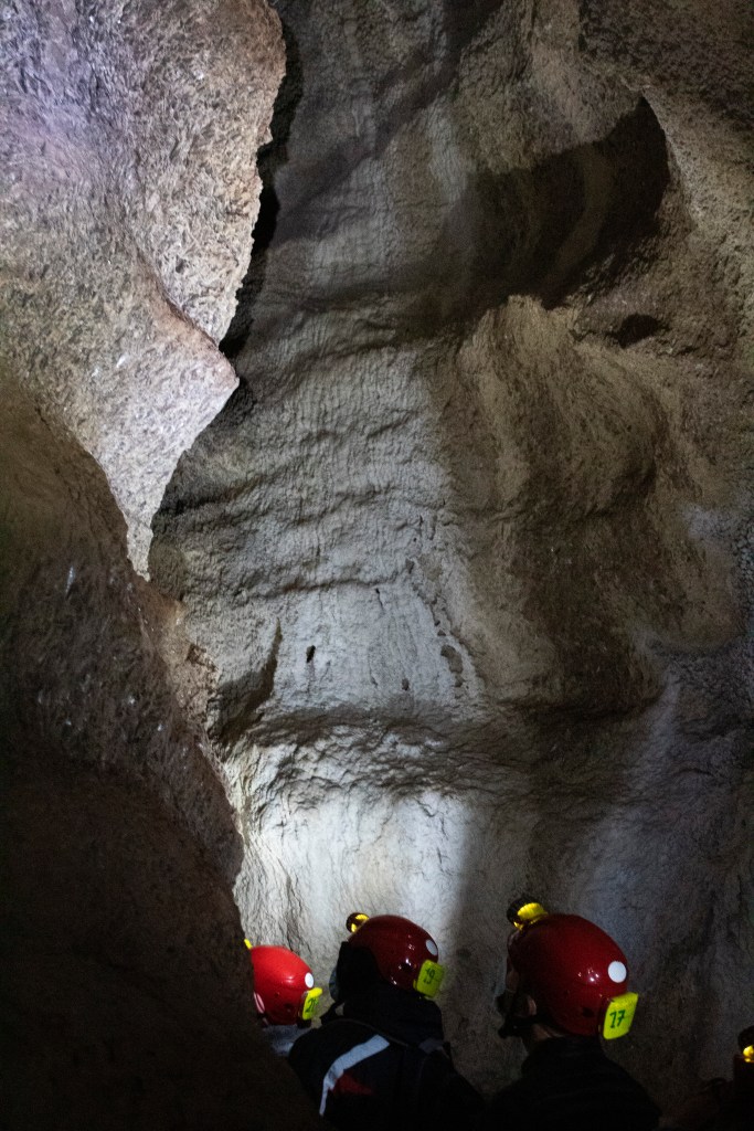 A pochi passi dall’antico borgo si trova l’entrata delle Grotte di Onferno. Il centro visita, situato nell’antica pieve di Santa Colomba, è il punto di riferimento per le visite guidate alla grotta e le escursioni lungo i sentieri della Riserva. Prima di partire per il tour, la guida ci munisce di caschetto con pila per attraversare le grotte in piena sicurezza. Vi consiglio di vestirvi con indumenti caldi ed impermeabili perché la temperatura all’interno delle grotte è di circa 12 -15°C e di indossare scarpe da trekking per avere maggiore stabilità durante il percorso. Prima di raggiungere l’entrata delle grotte, percorriamo un brevissimo tratto all’interno del bosco: nonostante sia inverno la natura ci regala innumerevoli sorprese. Siamo circondati da roverelle, aceri, arbusti di pungitopo e da bellissimi bucaneve, rari da ammirare a questa altitudine. Ma ecco che a 20 metri da noi, nella cavità di una quercia, riposa un bellissimo esemplare di allocco. Man mano che ci avviciniamo all’entrata delle grotte la vegetazione cambia: notiamo sempre più spesso la presenza di felci. Giunti all’ingresso accendiamo le torce e siamo pronti per il tour in cavità.
