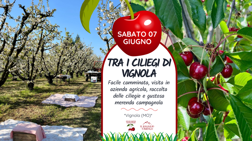 Per la prima volta Il Bagaglio Turistico vi porterร alla scoperta di un mondo bucolico: quello dei ciliegi di Vignola. Da una parte le rive del Panaro dallโaltra meravigliosi paesaggi collinari incredibilmente colorati dalle ultime fioriture primaverili e dal rosso delle ciliegie mature. Una camminata adatta a tutti, grandi e piccoli esploratori, che attraverserร sentieri e strade secondarie della collina di Vignola. Al termine della nostra escursione faremo un bellissimo picnic sotto i ciliegi dellโAzienda Agricola Vezzali Golinelli: sarร davvero magico. Ma non รจ finita qui! Ci aspetta un pomeriggio di pure divertimento: scopriremo i segreti della raccolta delle ciliegie e ci dedicheremo alla loro raccolta con vecchi cesti di vimini. Concluderemo la giornata insieme con una gustosissima merenda campagnola offerta sotto i meravigliosi ciliegi.
