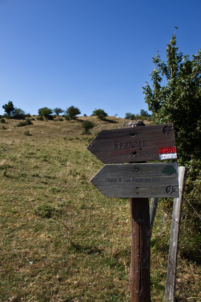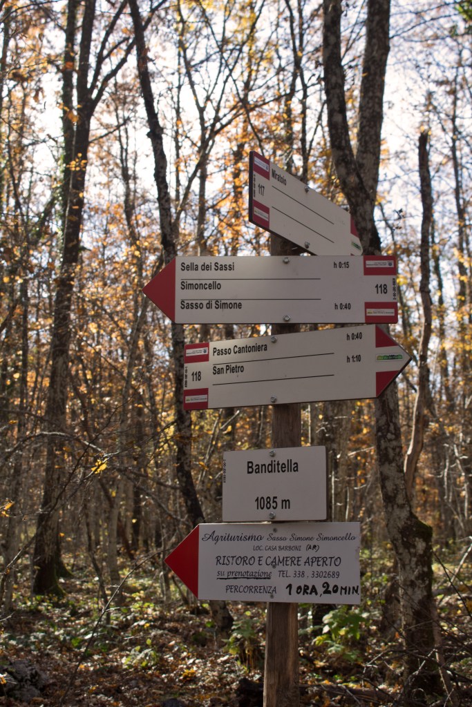 Al bivio successivo, dove la strada risulta franata, deviamo a sinistra e prendiamo il sentiero n. 17 che conduce alla vetta del Sasso Simone in circa 45/50 minuti di cammino.